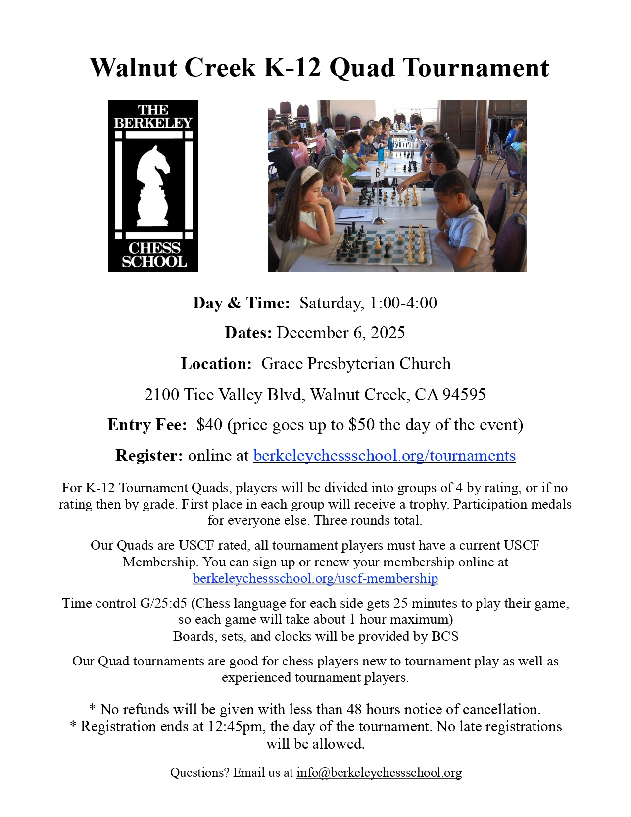 K-12 Tournament Quads. Players will be divided into groups of 4 by rating, or if no Rating then by Grade. First place in each group will Receive a Trophy. Participation Medals for everyone Else. 3 rounds Total Rounds are from 1pm - 4pm All Tournament players must be USCF members. You can sign up or renew your USCF Membership here.